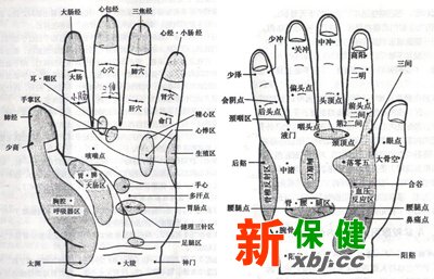 手背合谷穴、手腕神門、手背食指根第二二間、拇指丘胃脾大腸區。