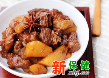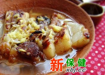 原料:五花肉適量、山藥一根、八角一個、老抽、糖、料酒等。