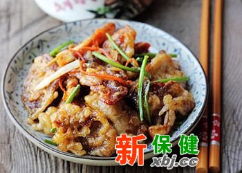 3、里脊肉片然后沾淀粉糊,下油溫七成熱的油鍋里炸制,炸制肉片定型后撈出;再復炸一次;