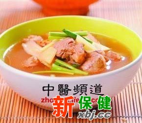 用料:羊肉500克、當歸30克、生姜50克。羊肉用清水洗凈后再用生姜爆炒,當歸用紗布包裹,再與爆炒好的羊肉一起煮湯。