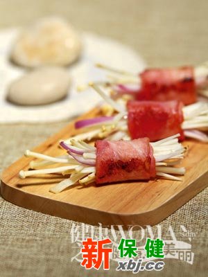2. 將培根每片從中間切成兩半,用一片切好的培根放上一小段切好的金針菇及少許洋蔥絲,然后從挨著自己身體的這個(gè)方向慢慢向外卷。卷的時(shí)候要緊一點(diǎn),卷到頭兒之后用牙簽固定