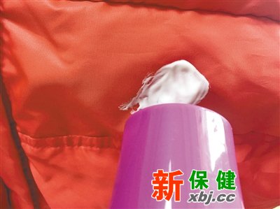 實驗過程:首先,在羽絨服的帽子處滴一滴食用油,讓油被羽絨服吸收;接著,取少許面粉用冷水調成糊,涂在羽絨服的油污處;然后將衣服拿到陽臺去晾干,大概兩小時后揭去面粉。